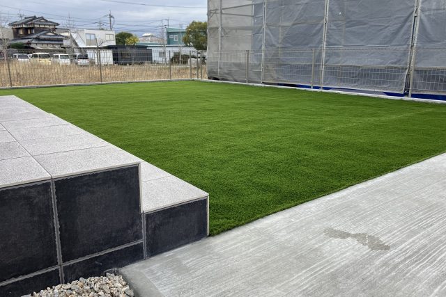 駐車場の奥には、開放感溢れる広々とした人工芝の庭を設置しました。タイルデッキとのつながりを意識し、一