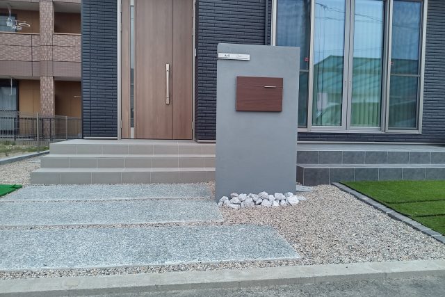 質素に、まとまりのあるアプローチに機能門柱を設置したシンプルな外構です。