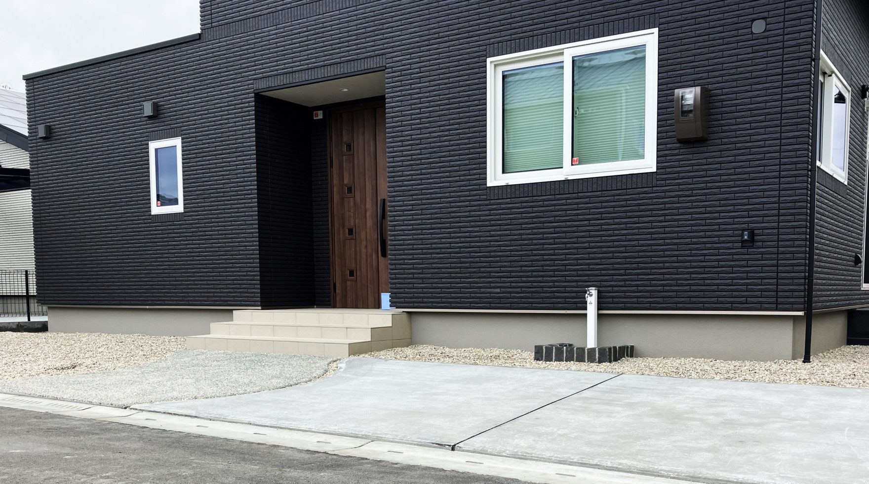 玄関まわりやアプローチは、シンプルながらも洗練されたこだわりにこだわりました。ピンコロ石でデザインした水栓パンがさりげないアクセントとなり、実用性とおしゃれを両立させました