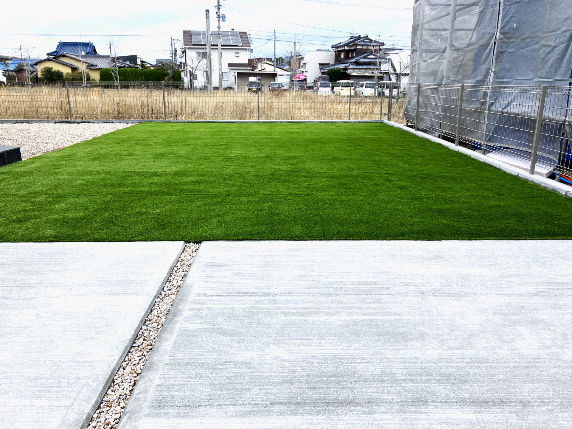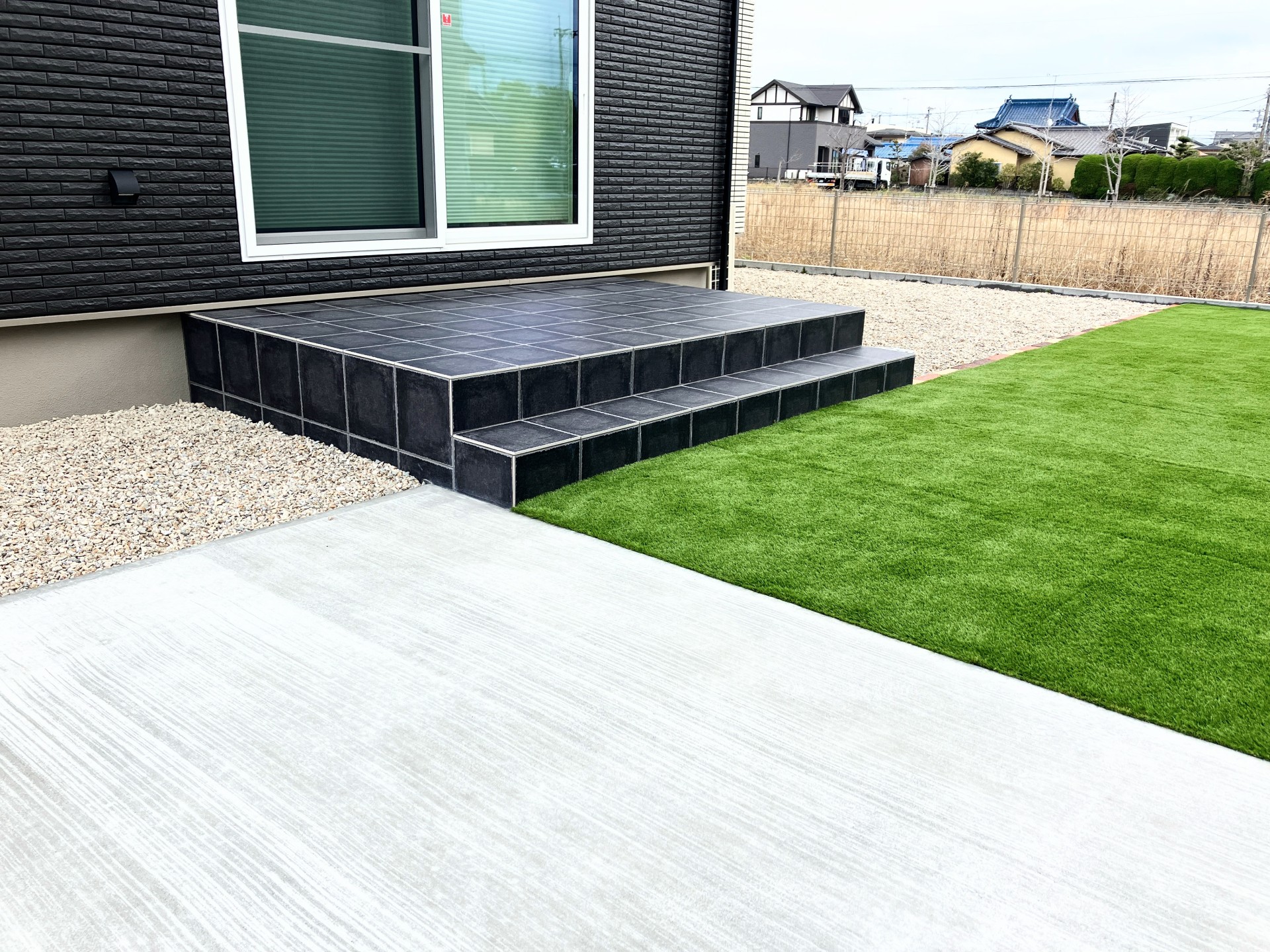 駐車場の奥には、開放感溢れる広々とした人工芝の庭を設置しました。タイルデッキとのつながりを意識し、一体感のあるデザインに仕上げることで、より広く伸びる空間を演出しました。お子様の遊び場や、ご家族でくつろぐスペースとしても最適です。