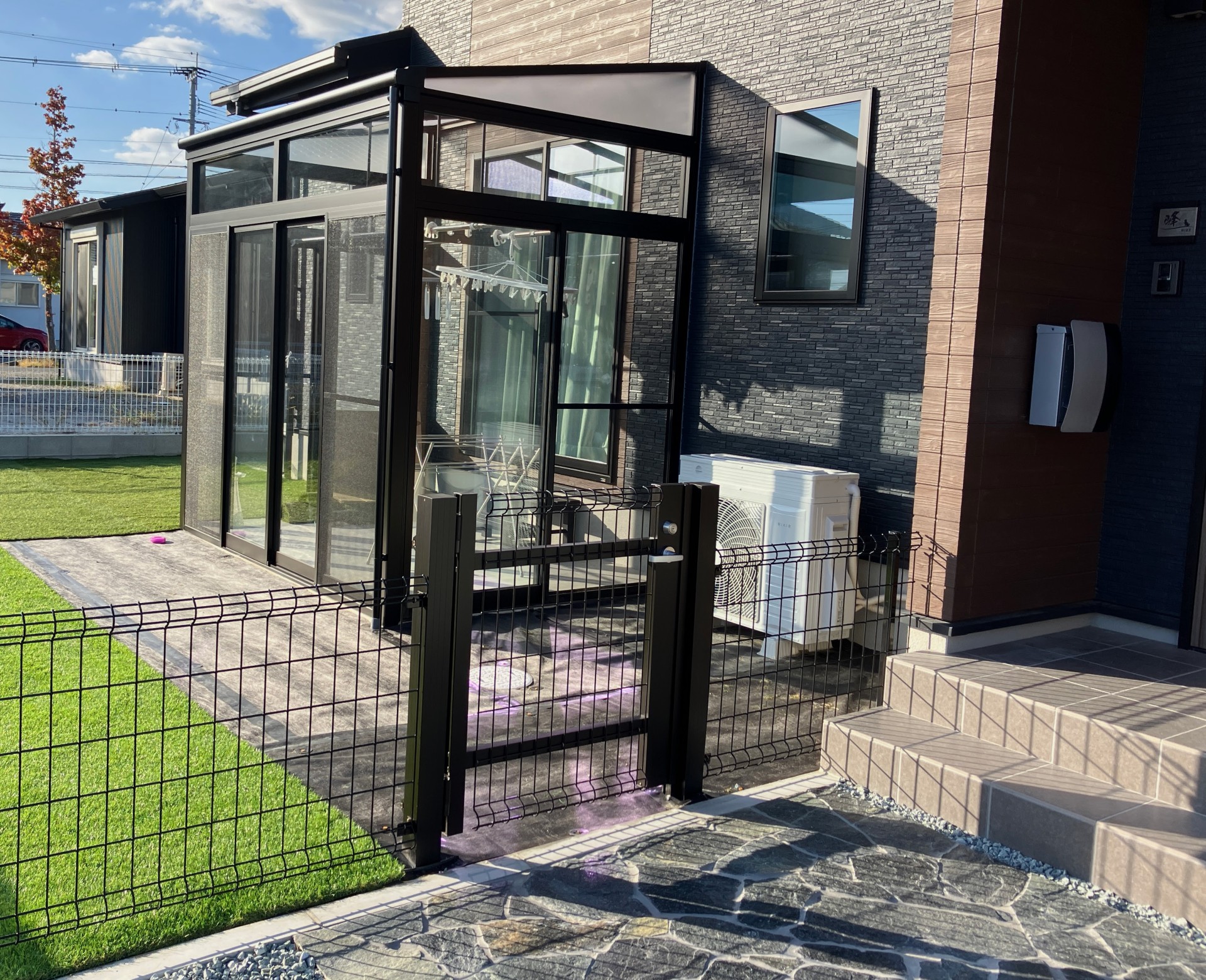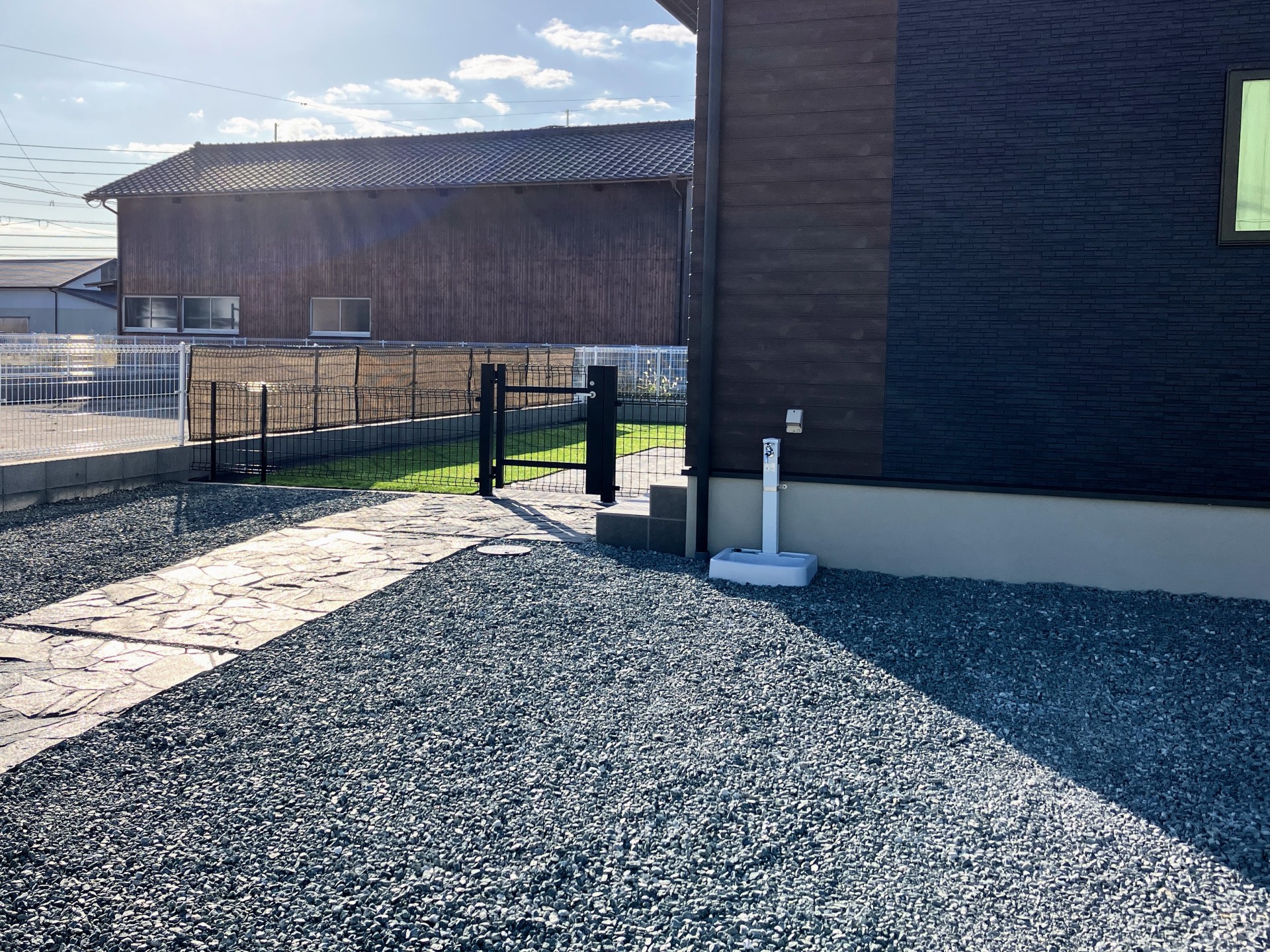 必要なものだけを選んで 佐賀市(M様邸) 2023/11/10 テラスは虫嫌いな奥様の必需品 庭でワンコを遊ばせたいので仕切りのフェンスは隙間なく(小型犬なので) ポストは白で清潔感があるものをチョイス 表札はワンポイントで犬のマークが入ってます。 アプローチは雨の日に汚れないように自然石乱形でシンプルに。 駐車スペースは砂利敷ですが道路に砂利が出ないように道路に沿ってコンクリート仕上げ。 尚、庭の人工芝はご主人自ら頑張って貼られています。 犬もお子さんも安心して遊べる庭ですね。